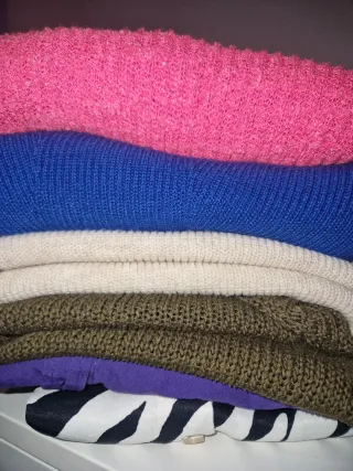 Set di capi in maglia per donna, ideale per aggiungere varietà al tuo guardaroba. Taglia M. Include: maglia rosa, maglia fine blu, maglia naturale, maglia verde oliva, camicia viola Zara, camicia con stampa zebrata in bianco e nero.