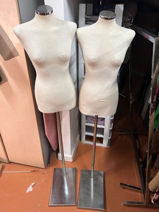 In vendita due busti manichino, perfetti per esporre abbigliamento. - Base metallica argentata. - Rivestimento in tessuto beige.