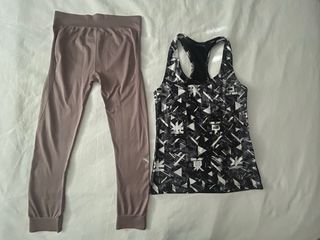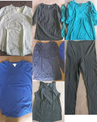 Set di vari capi di abbigliamento progettati per la gravidanza. - 1 felpa grigia con dettagli. - 2 maglioni a maniche lunghe, uno taglia L di H&M e l'altro di C&A taglia M. - 2 magliette a maniche 3/4. Una di H&M taglia L e l'altra di C&A taglia M. - 1 leggings neri di H&M taglia 46. - T-shirt senza maniche nera di H&M taglia L.