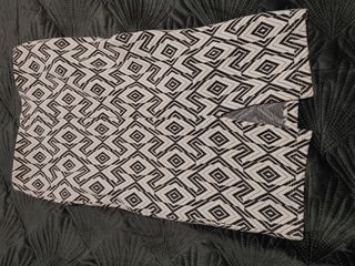 Prenda di abbigliamento con un accattivante stampa geometrica in bianco e nero. Design con rombi e linee intrecciate. Tessuto con texture.