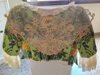 Set di abbigliamento fallero che include peineta, scarpe e accessori. Design floreale vibrante. Dettagli in pizzo e paillettes dorate. Maniche a campana con volant.