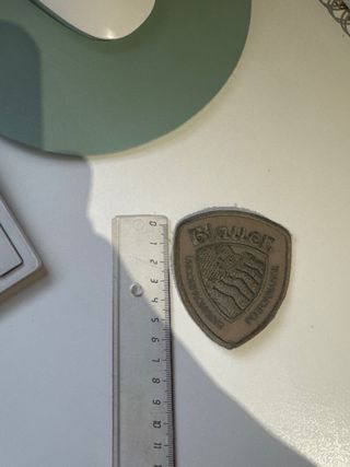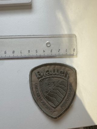 Pezza del marchio Blauer con un design distintivo. Colore beige e grigio. Design a scudo.
