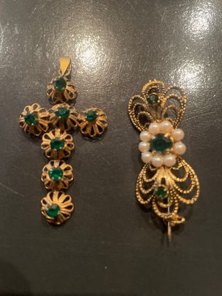 Set vintage che include un ciondolo a forma di croce e una spilla. - Ciondolo a croce con dettagli floreali e pietre verdi. - Spilla con design ad anello decorato con perle e una pietra verde centrale.