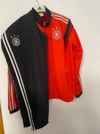Completo sportivo da calcio della nazionale tedesca. - Giacca con cerniera completa - Pantaloni lunghi con cintura elastica - Design con le iconiche tre strisce Adidas - Stemma della nazionale tedesca ricamato