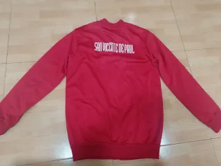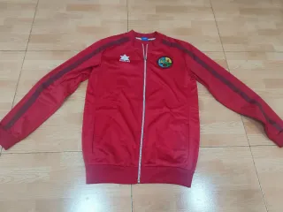 Felpa della squadra di calcio. Colore rosso vibrante. Design con strisce sulle maniche. Distintivo sul petto.