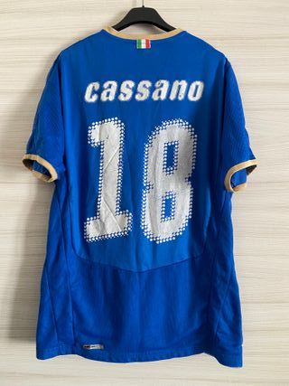 Maglia da calcio Puma da uomo, taglia M, con il nome Cassano e il numero 18. - Colore blu. - Dettagli con bordi color oro sulle maniche e sul colletto. - Patch tricolore italiana sul colletto.