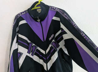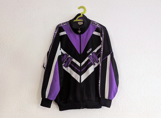 Giacchetta vintage originale JAKO con design classico degli anni '90 in nero, viola e bianco. Il suo stile ricorda chiaramente le divise e i tute da allenamento del Real Madrid tra gli anni '90 e 2000 (non è un capo ufficiale del club). Chiusura con cerniera completa, leggera e comoda, ideale per streetwear, look retrò o stile calcistico. Un pezzo molto ricercato dagli amanti dell'abbigliamento sportivo vintage. Taglia: M. #VintageJacket #JAKO #90sStyle #FootballVintage #RetroSportswear #TrackJacket #FootballAesthetic #RealMadridStyle #InspiredByFootball #StreetwearVintage #ColorBlock #VintageClothing y2k casillas vinicius mbappe bernabeu