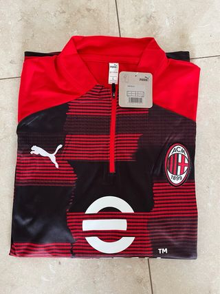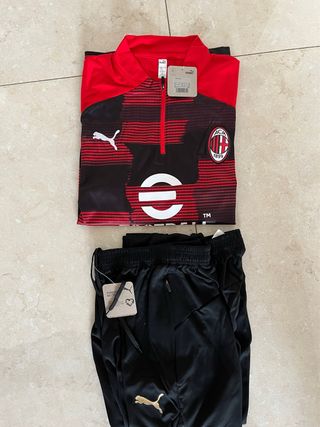 Completo da calcio del Milan, composto da maglia e pantaloni. - Maglia a maniche lunghe con zip. - Pantaloni con elastico in vita e laccetti, zip a fondo gamba. - Logo Puma ricamato.