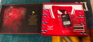 Maglietta della nazionale di calcio della Thailandia con scatola espositiva. La scatola espositiva è danneggiata, graffiata durante il viaggio. La maglietta è intatta, nuova con etichette. Nel pacchetto è inclusa una maglietta in miniatura. Pezzo totalmente originale. Misure: 53 cm da ascella a ascella e 74 cm di lunghezza. - Design con mappa della Thailandia. - Dettagli di onde sulle maniche. - Bandiera della Thailandia sul petto. - Logo ufficiale del marchio.