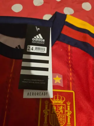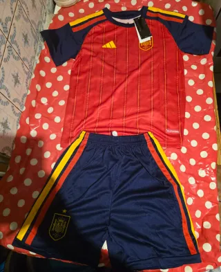 Set maglietta e pantaloncini calcio della Spagna. ## Descrizione del prodotto **Set per bambini della Nazionale Spagnola di Calcio - Equipaggiamento locale** ## 📦 Contenuto del pack - Maglietta da calcio - Pantaloncini coordinati ## 🎽 Caratteristiche **Maglietta:** - Colore rosso con strisce verticali in giallo/oro - Maniche blu navy con strisce tricolori (blu, rosso e giallo) sulle spalle - Stemma ufficiale della **Real Federación Española de Fútbol (RFEF)** sul petto - Logo **Adidas** in giallo oro - Stella dorata sopra lo stemma - Iscrizione **"España"** sul collo interno posteriore - Tecnologia **CLIMACOOL**