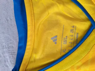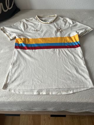 Maglietta da calcio della nazionale colombiana, marca Adidas. Design vivace in giallo con dettagli in blu e rosso. Tecnologia Climacool per una maggiore traspirabilità. Stemma della federazione colombiana ricamato sul petto. Iconiche strisce Adidas sulle spalle. Originale e completamente nuova, con etichetta.