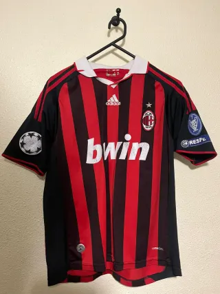 Maglietta calcio dell'AC Milan con lo sponsor bwin. - Design a righe rosse e nere. - Logo Adidas in bianco. - Stemma dell'AC Milan. - Patch della Champions League.