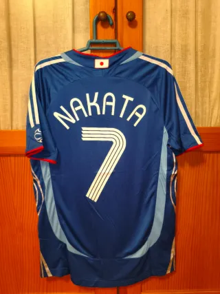 Maglietta della nazionale giapponese di calcio, numero di maglia 7, con il nome Nakata. Design con dettagli in bianco e blu chiaro. Bandiera del Giappone sul retro del collo.