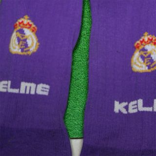 Calze da calcio del Real Madrid della stagione 96/97. Design viola, logo del club ricamato, dettaglio di impronte di zampe, marca Kelme.