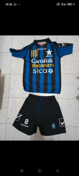 Completo sportivo composto da maglia e pantaloncini. - Maglia a maniche corte con strisce verticali blu e nere. - Pantaloncini neri con laccetti. - Logo GIVOVA presente su entrambi i capi.