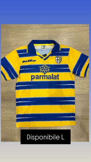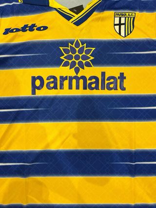 Maglia vintage del Parma Calcio, un capo iconico per gli appassionati. - Design a strisce gialle e blu. - Sponsor Parmalat. - Logo Lotto.