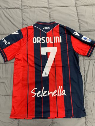 Maglia da calcio Macron indossata da Orsolini, numero 7. - Design a strisce verticali rosse e blu. - Logo Macron sulle maniche. - Nome ORSOLINI e numero 7 stampati sul retro. - Sponsor Selenella sul fronte.