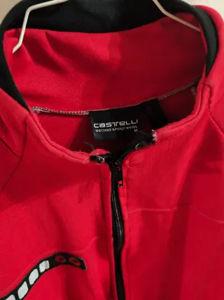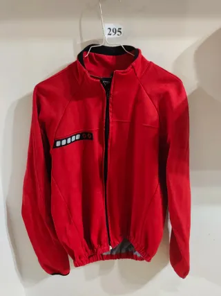Giacchetta ciclismo taglia M. Uomo di colore rosso. Design con collo tondo. Chiusura con cerniera frontale. Tasca sul petto. Polsini ed elastico inferiore.