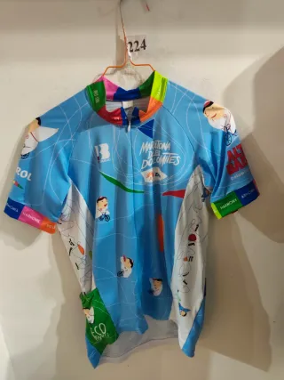 Maglia da ciclismo a maniche corte con una vivace stampa a tema. - Fantasia con disegni di ciclisti e scritte. - Collo colorato. - Zip frontale.