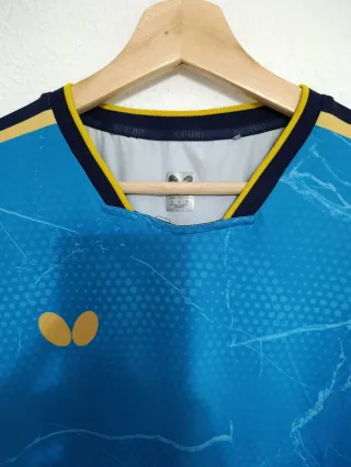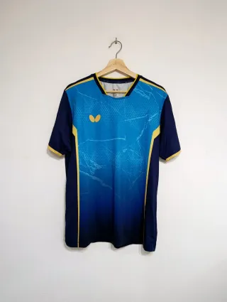 Maglietta sportiva del marchio Butterfly, ideale per il tennis da tavolo. Presenta un design moderno e vivace. - Design sfumato in toni blu. - Dettagli in giallo. - Logo Butterfly sul petto.
