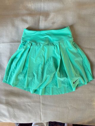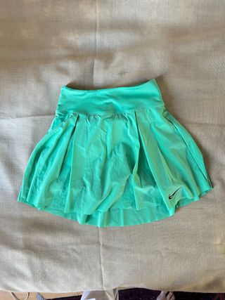 Gonna da tennis Nike in colore verde, ideale per l'attività sportiva. Design con volant. Logo Nike visibile. Indossata una volta per un servizio fotografico. Taglia 34-36.