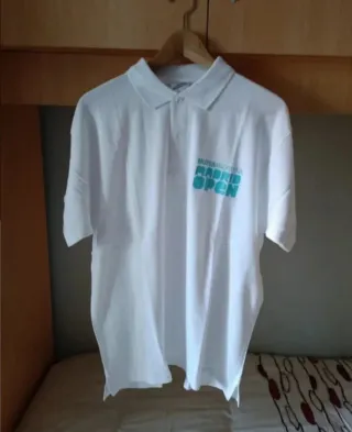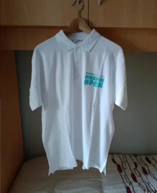 Polo bianco con il logo del Mutua Madrid Open. - Design tipo polo. - Stampa del torneo in color turchese. - Taglia L. Marca JHK. - Polo del Diario ABC.