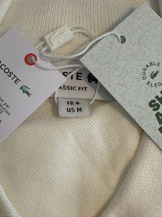 Polo Lacoste di colore bianco con un design ispirato al tennis. Presenta un motivo grafico sul davanti e dettagli a contrasto sul colletto. - Motivo grafico Rene Did It con racchetta da tennis. - Colletto a costine con righe verdi. - Chiusura a due bottoni. - Vestibilità classica. Lacoste polo bianca taglia M motivo tennis nuova Polo manica corta nuova, mai indossata. Taglia M. Motivo tennis.