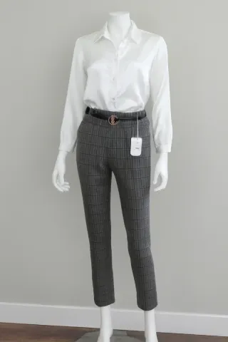 Pantalone donna elegante e versatile. Fantasia tartan grigia, perfetta per look casual chic o da ufficio. Taglia M (etichetta XL, ma vestibilità media). Modello con coulisse in vita per una vestibilità comoda e regolabile. Completo di cintura nera con fibbia dorata: accessorio incluso che valorizza il punto vita. Nuovo, mai indossato, ancora con cartellino. Marca: New Collection, sinonimo di stile contemporaneo. Tessuto morbido e confortevole, ideale per tutte le stagioni. Perfetto da abbinare con sneakers, stivaletti o mocassini. Un must-have per chi ama il tartan e i capi senza tempo.