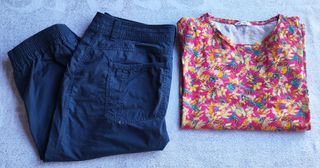 Set di pantaloni e maglietta da donna. - Pantaloni scuri usati, Quechua. Taglia L/XL. - Maglietta con stampa floreale vibrante usata. Cortefiel. Eco-Friendly. Taglia L.