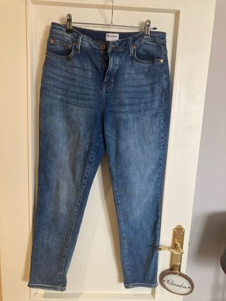 Jeans a taglio mom fit e lunghezza alla caviglia, realizzati con materiali ecologici. Molto poco usati, li vendo perché ora sono troppo grandi. - Design moderno e comodo. - Vita alta. - Effetto lavato.