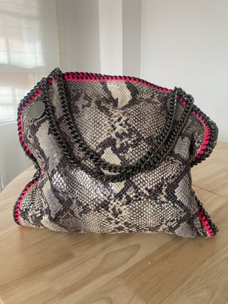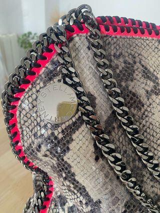 Iconica borsa Falabella di Stella McCartney con stampa pitone in tonalità grigie e bordi in rosa neon. Caratteristica catena in metallo scuro del marchio. Molto versatile: può essere portata come tote a mano o piegata a tracolla. Materiale eco-friendly di alta qualità.