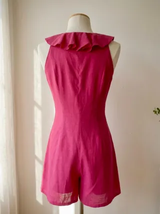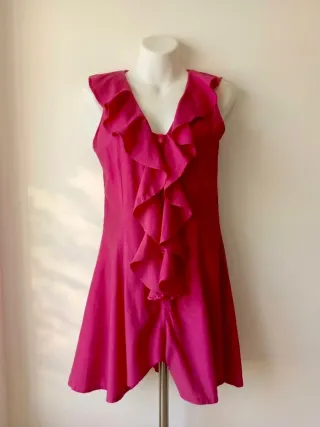 L'alleato perfetto per i tuoi eventi di questa stagione! 🌸Prezioso mono corto in fucsia intenso. Super favorevole grazie al suo scollo a V e ornato con volants. Aperto davanti e con bottoni per la chiusura. 🌟Stile: chic, romantico e femminile. 🌟Design originale difficile da trovare. 🌟Ideale per: cena speciale, comunione, battesimo o per brillare in primavera/estate. ✅Piccolo difetto appena visibile nel volant (vedi ultima foto) non influisce sul suo uso. - Lunghezza: 80 cm, spalla: 42 cm 🧵Composizione: cotone 🎁Spedizione rapida, sostenibile in scatola di cartone riciclato eco-friendly 🌍