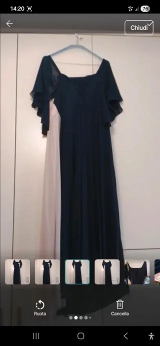 Abito lungo da donna, ideale per cerimonie, serate o eventi speciali. Presenta un design sofisticato con maniche ampie. - Colore principale blu scuro. - Dettagli in rosa. - Tessuto leggero e fluttuante.