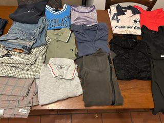 Lotto di abbigliamento firmato con capi di alta qualità.20 capi - Maglia blu con scritta Everlast. - Polo verde oliva con logo Diadora. - Polo bianca con logo La Martina. - Maglia a righe viola e bianche. - Maglia blu con bottoni. - Maglia nera in pizzo. - Maglia rossa. - Felpa grigia con zip. - Pantaloni in denim. - Camicia a quadri. - Pantaloni a quadri.