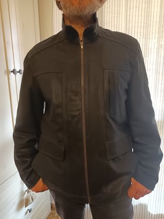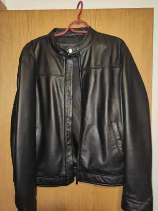 Giubbotto in pelle elegante e moderno. - Colletto a mao. - Chiusura con cerniera. - Tasca laterale con bottone.