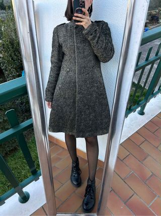 Cappotto Costume National elegante in lana mélange tweed color grigio scuro. Linea leggermente svasata sul fondo avvitato con collo alto strutturato, molto caldo Taglia 44 ottime condizioni solo due piccoli buchini nella fodera vicino al logo Misure: Da spalla a spalla 43 cm Da ascella a ascella 50 cm Vita da cucitura a cucitura 45 cm Lunghezza 98 cm