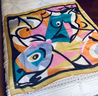 Foulard quadrato Christian Fischbacher di medie dimensioni in chiffon di seta 100% di primissima qualità. Misura 85 x 85, stampa geometrica astratta multicolor pastello, davanti e dietro uguali, orlo a mano, firmato. Bellissimo e perfetto su qualsiasi abbigliamento un po’ spento, per ravvivare il viso. Condizioni buone per l’usato, nessun difetto.