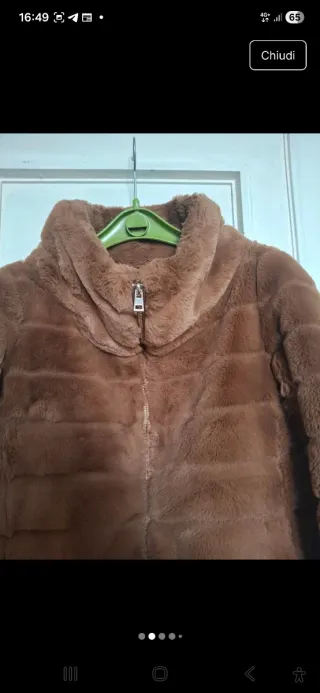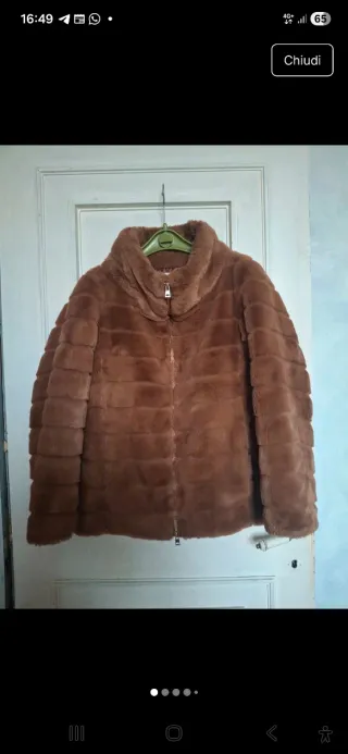 Giubbotto in pelliccia sintetica colore cammello firmato Conbipel. Taglia italiana 42. È dotato di una cerniera in metallo dorata apribile anche dal basso. È molto caldo e morbido. Sul davanti ha due tasche laterali con cerniera invisibile. Mai usato, in perfette condizioni.