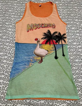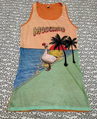 Vestito a spalla firmato Moschino con divertente stampa estiva, da spiaggia, palme e un'oca. Ideale per la piscina o la spiaggia. Taglia L. In perfette condizioni (uso minimo). Lo vendo perché ho ingrassato e mi segna la pancia.