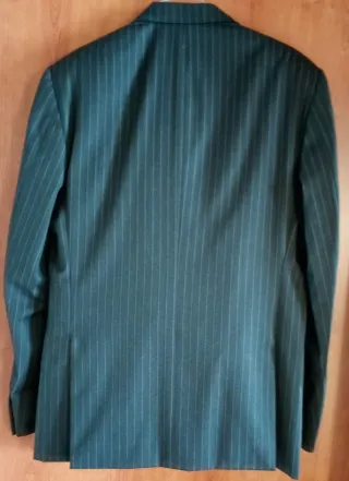 Completo sartoriale da uomo composto da giacca e pantaloni in tessuto gessato verde scuro, realizzato con lana Reda Super 100’s High Twist. La giacca presenta revers classici, tre bottoni frontali, tasche con patta e spalla strutturata. I pantaloni hanno taglio classico con passanti e tasche laterali. Il capo è firmato PRIA & DONI, con etichette interne REDA e MASSACRI® 1964, entrambe indicanti produzione italiana di alta qualità.taglia 48/M.