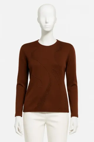 Maglioncino marrone dal fascino senza tempo, perfetto per un look sofisticato e chic. Ricami eleganti e microperline decorano il davanti e le maniche con motivi sinuosi e raffinati. Composizione di alta qualità: 80% lana, 10% cotone, 10% elastan per una vestibilità comoda e avvolgente. Taglia XXL: ideale per chi cerca stile, comfort e personalità in un solo capo. Firmato “Yifan & Alessia” e “Vittoria di Ancona”: eccellenza e design made in Italy. Versatile e stiloso: si abbina perfettamente a jeans, pantaloni eleganti o gonne. Condizioni eccellenti, pari al nuovo, pronto per essere indossato. Un capo che cattura lo sguardo,