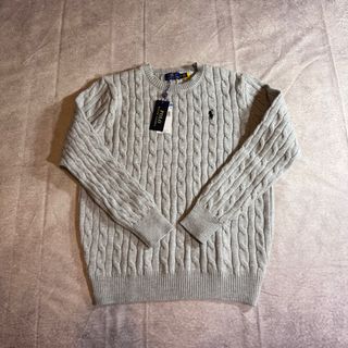Elegante maglione a trecce firmato Polo Ralph Lauren. - Colore grigio mélange. - Taglio classico. - Logo del cavallo ricamato sul petto.