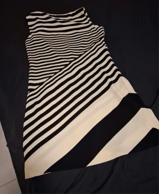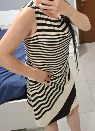 ✨ Raffinato ed elegante, questo vestito a righe firmato Madrilena è un capo che non può mancare nel tuo guardaroba! 👗 Taglia L, realizzato in 100% poliestere, leggero, fluido e comodo da indossare. 🎨 Le righe nere e panna e il taglio asimmetrico lo rendono originale e slanciato: valorizza la figura con un tocco moderno e sofisticato. 🇮🇹 Made in Italy, sinonimo di qualità e stile senza tempo. 💃 Indossato solo un paio di volte, è in condizioni impeccabili, come nuovo. Ideale per cerimonie, eventi, ufficio o anche per una cena elegante – ti farà sentire subito chic e sicura di te. English: ✨ Elegant and timeless, this striped Ma