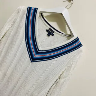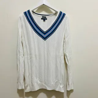 Pullover girocollo con scollo a V firmato Tommy Hilfiger. Presenta un motivo a trecce sul davanti e sulle maniche, con un'elegante banda a righe sul collo. - Composizione: 100% cotone fine.