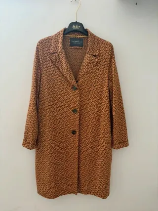 Soprabito in lana grezza firmato C_amm, dal design essenziale e materico. Taglia unica, senza cartellino, con vestibilità XL donna. Misure: spalle 58 cm, lunghezza 94 cm, maniche 44 cm. Chiusura anteriore con bottoni a clips e due tasche frontali. Colore caldo, tra ruggine, mattone e terracotta, con effetto mélange. Capo ben tenuto, ideale per mezza stagione e inverno.