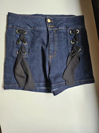Shorts firmato Cristinaeffe in denim blu scuro con cuciture a contrasto, vita media e chiusura frontale con doppio bottone e zip. Dettagli laterali con occhielli metallici dorati e lacci in tessuto nero. Taglia 44