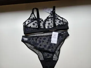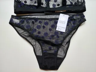 Splendido completo intimo di lusso firmato Simone Pérèle Paris. Il set è composto da un reggiseno a triangolo (senza ferretto per il massimo comfort) e slip coordinato, entrambi realizzati in pregiato tulle nero trasparente con ricami floreali a contrasto in blu notte. Taglie sul cartellino.