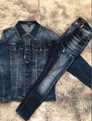 Completo firmato Dsquared2 composto da giacca e jeans. - Giacca in denim con dettagli a macchie. - Jeans in denim con dettagli a macchie e strappi.