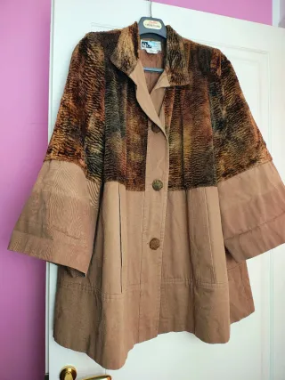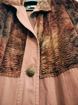 Splendido ed esclusivo caban vintage firmato Antonella Calò (Firenze), icona della manifattura artigianale toscana. Un pezzo unico che incarna perfettamente l'estetica ricercata degli anni '80 e '90. Il capo si distingue per un raffinato design patchwork che alterna pannelli in morbido tessuto di cotone color caramello chiaro a inserti in pelliccia ecologica a riccio in tonalità marrone caldo. Chiusura frontale con grandi bottoni gioiello rivestiti in pelliccia coordinata Fodera interna trapuntata Parte tessile 45% Cotone , estremamente morbido al tatto. Condizioni: Ottimo stato vintage, conservato con cura