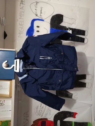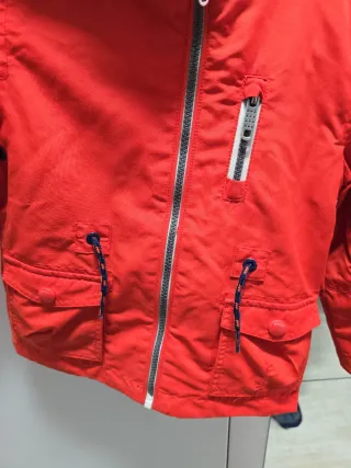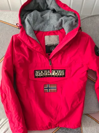 Giacchetta stile anorak del marchio Napapijri. Taglia per bambini. Design con cappuccio. Tasca frontale con cerniera. Patch con bandiera nella parte anteriore. C'è una piccola macchia visibile nell'ultima foto, non si sa di cosa si tratti. Usato molto poco.